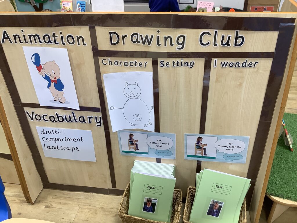 Mark making is the first step towards successful early writing. Children are encouraged to use a selection of different writing materials on a variety of scales. This could be writing on a post it note or making gigantic marks on the playground; it could be using brushes or magic wands. The importance of this mark making practise is to embed fluent movement which will eventually lead to forming recognisable letters. This is further supported by dough disco sessions. Within Nursery, children take part in Drawing Club three times a week which underpins these crucial skills. In addition to this, the children participate in Talk for Writing and have purposeful writing opportunities throughout the learning environment.